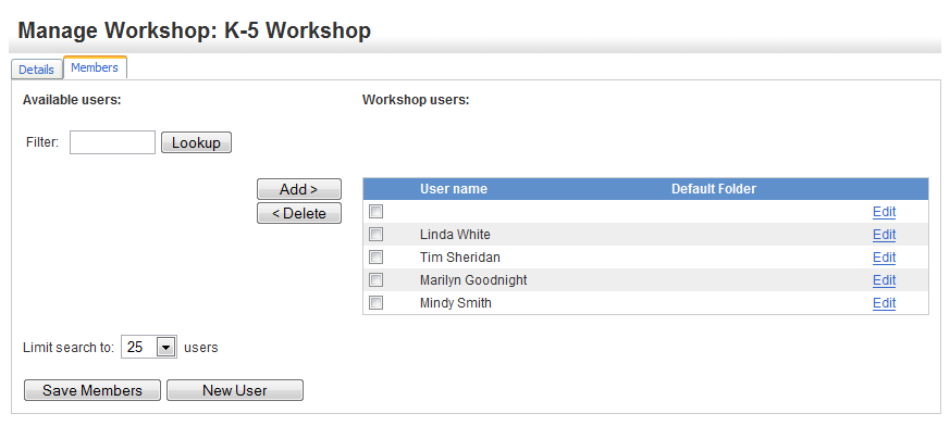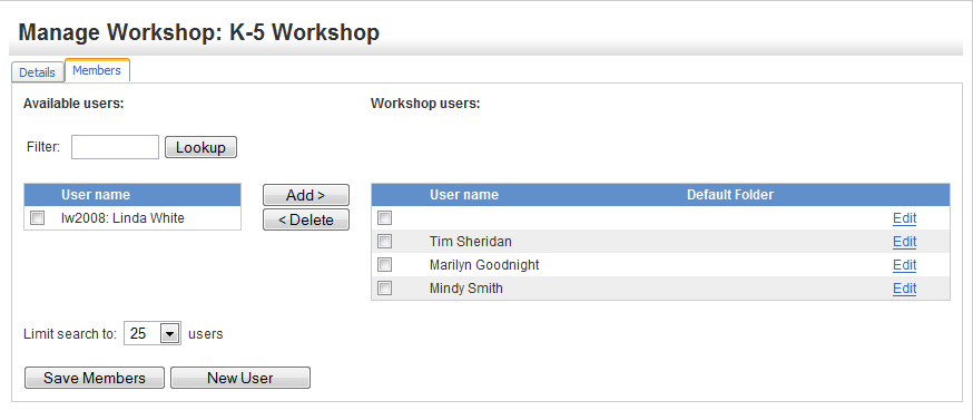 When a workshop is created, the Workshop Administrator typically assigns the team members to the workshops. The Manage Workshop Users interface allows multiple members to be added or deleted from the system at one time.